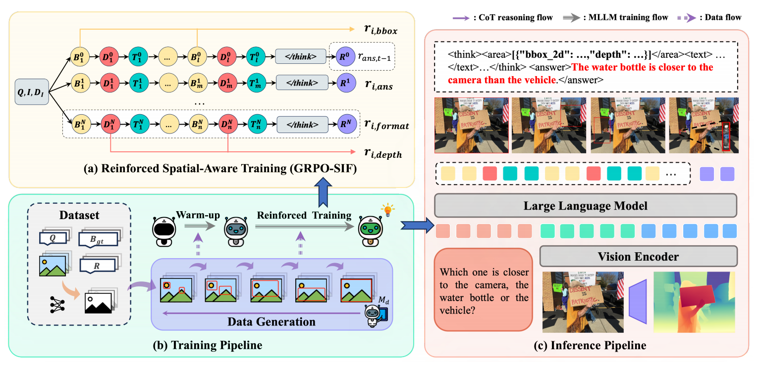 Abstract: Current multimodal large language models (MLLMs) still face significant challenges in complex visual tasks (e.g., spatial understanding, fine-grained perception). Prior methods have tried to incorporate visual reasoning, however, they fail to leverage attention correction with spatial cues to iteratively refine their focus on prompt-relevant regions. In this paper, we introduce SIFThinker, a spatially-aware "think-with-images" framework that mimics human visual perception. Specifically, SIFThinker enables attention correcting and image region focusing by interleaving depth-enhanced bounding boxes and natural language. Our contributions are twofold: First, we introduce a reverse-expansion-forward-inference strategy that facilitates the generation of interleaved image-text chains of thought for process-level supervision, which in turn leads to the construction of the SIF-50K dataset. Besides, we propose GRPO-SIF, a reinforced training paradigm that integrates depth-informed visual grounding into a unified reasoning pipeline, teaching the model to dynamically correct and focus on prompt-relevant regions. Extensive experiments demonstrate that SIFThinker outperforms state-of-the-art methods in spatial understanding and fine-grained visual perception, while maintaining strong general capabilities, highlighting the effectiveness of our method.